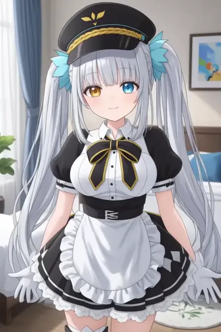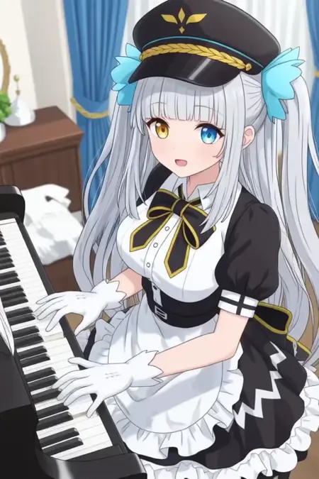 sample prompt:Kagura Mea, anime-style girl. The image features an anime-style character with long white hair styled in two braids. The character has one blue eye and one brown eye, giving them a distinctive appearance. They are wearing a black and white uniform with gold accents, including a black hat with a gold trim and a white scarf tied around their neck. The character is also wearing white gloves and has a cheerful expression on their face.The outfit includes a black bow tie and a white lace trim on the sleeves and skirt. (she is dancing:2.5), (chibi Nendoroid:3.5) in bedroom.