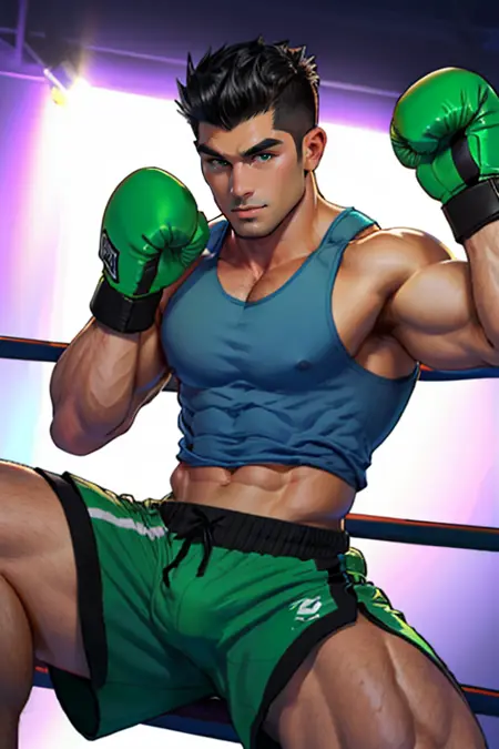 태그: Little_Mac, 단독, 검은 머리, 1남성, 남성 중심, 반바지, 근육질, 두꺼운 허벅지, �ank top, 유방근, 근육질 남성, bara, 팽창, 녹색 반바지, 복싱 장갑, 녹색 장갑.