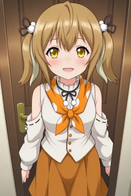 サンプルプロンプト: Inaba Haneru、アニメスタイルの女の子。画像には、薄茶色の髪をツインテールにまとめ、白いリボンで bow を結んだアニメスタイルのキャラクターが描かれています。キャラクターの目は大きく、金黄色で輝いて見えるほど表現力豊かです。キャラクターは、長袖と高めのカラーを持つ白いブラウスを着ており、その上には白いドット模様のオレンジ色のスカーフを首に巻いています。スカーフの前には bow がついています。衣装には、ハイウエストの茶色のスカートが含まれており、手首まで伸びる白い手袋を着用しています。 (she is dancing:2.5), (chibi Nendoroid:3.5) in bedroom.