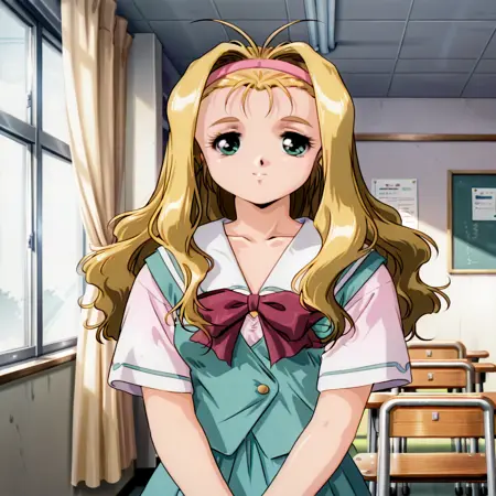 외모: saki, 긴 머리, 물결 모양 머리, 안테나 머리, 금발, 청록색 눈, 속눈썹, 약한 입술, 코