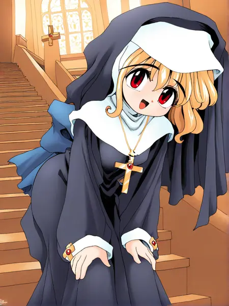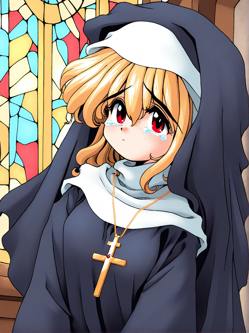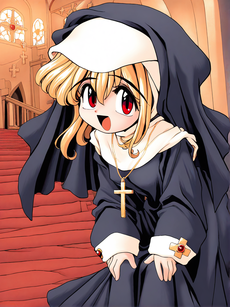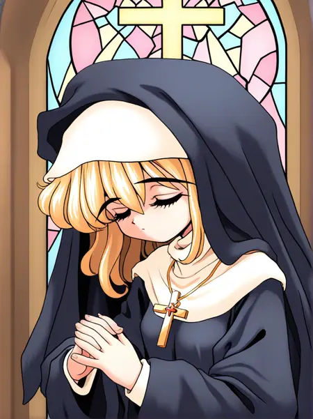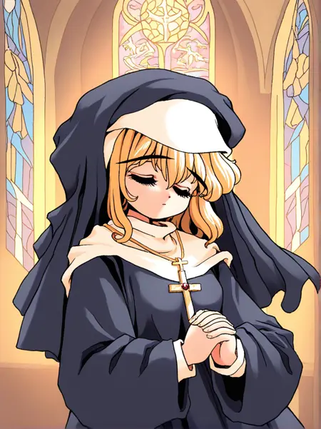nun, habit, blue bow, jewelry, cross necklace, long sleeves,
