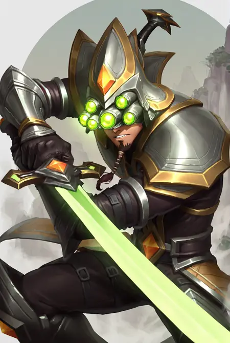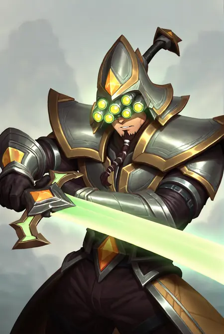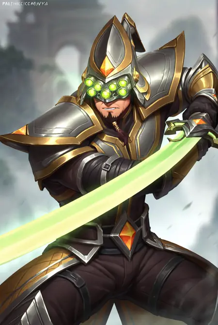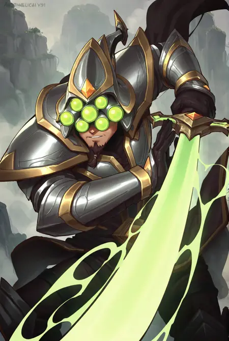 y1,armor,helmet,glowing eyes,facial hair,long goatee,gloves,gauntlets, sword, holding sword, weapon
