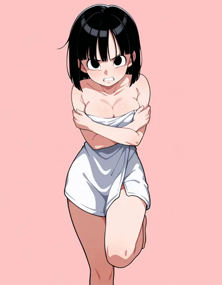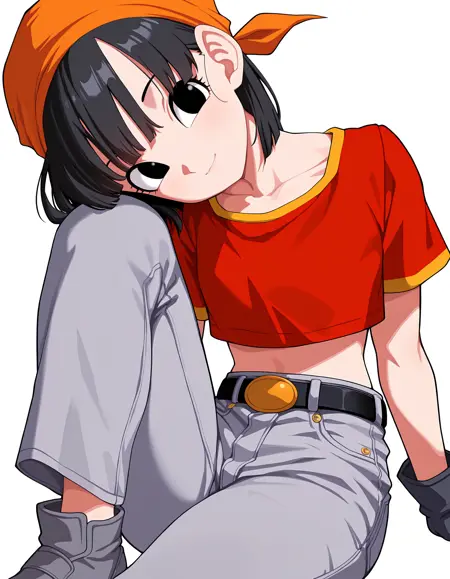 빨간 크롭탑, 청바지, 회색 바지, 검은 벨트, 밴다나