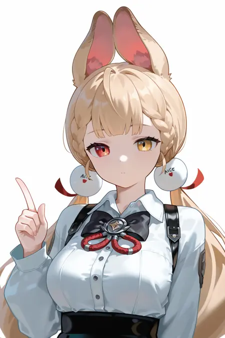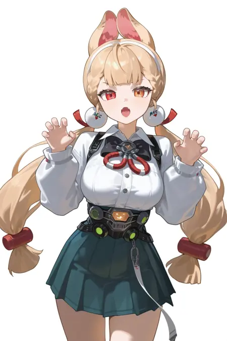alice thymefield, 1girl, blonde hair, hair ornament, heterochromia, red bow, bowtie, skirt, long hair, twintails, fingerless gloves, shirt, animal ears, pantyhose, white shirt, pleated skirt, long sleeves, black gloves, low twintails, black pantyhose