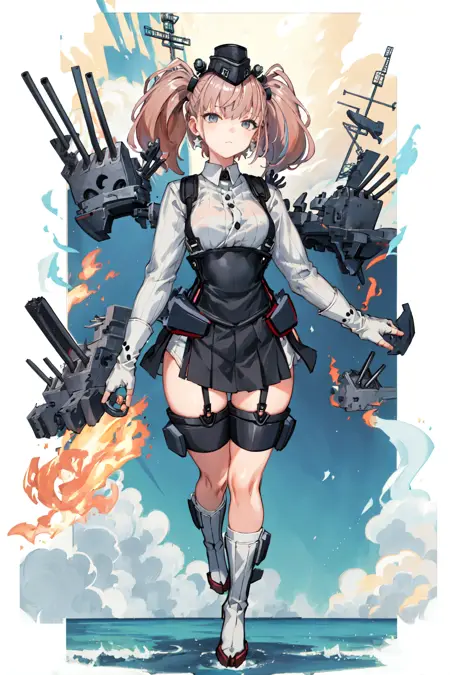 suspender skirt, gloves, breasts, garrison cap, partially fingerless gloves, white gloves, long sleeves, high-waist skirt, black skirt, white shirt, earrings, jewelry, star earrings, thigh strap, black headwear, anchor hair ornament, garter straps, rigging, hair ornament, dress shirt, headgear, camouflage, boots, rudder footwear, black footwear,