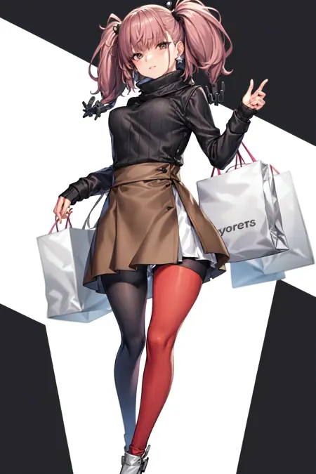 jewelry, earrings, alternate costume, sweater, long sleeves, shopping bag, asymmetrical legwear, black sweater, coat, pantyhose, skirt, mismatched legwear, turtleneck, single earring, star earrings, breasts, turtleneck sweater, hair ornament, ribbed sweater, boots, scarf, white footwear, white coat