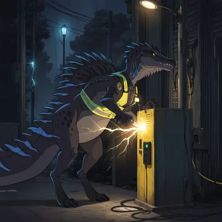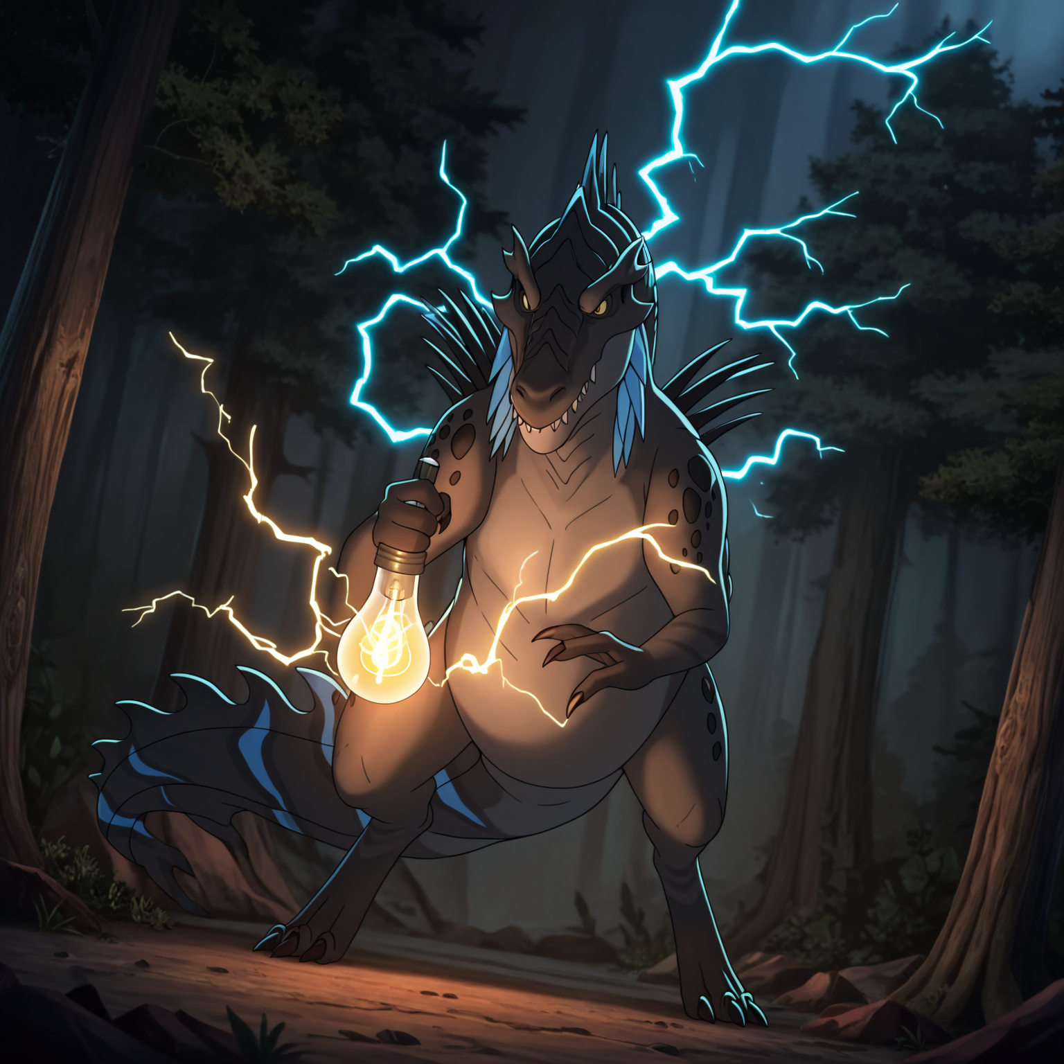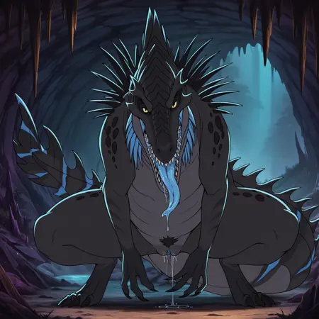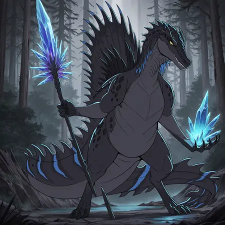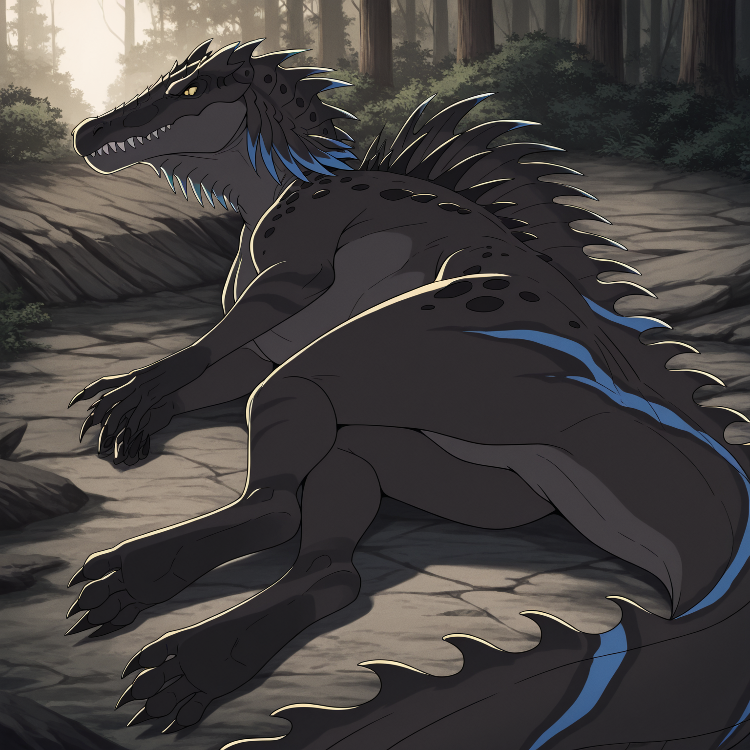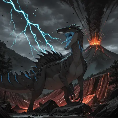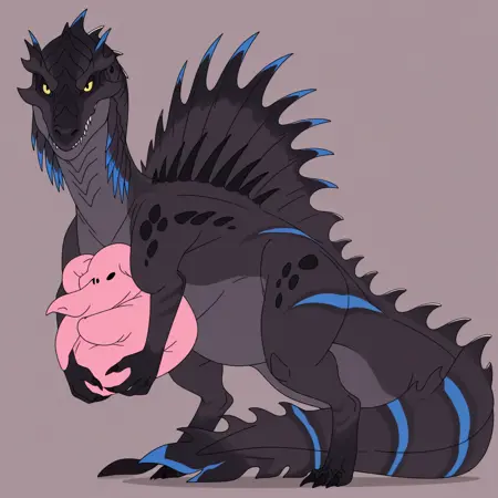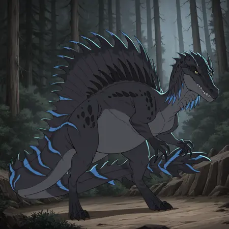 tfury, 1girl, spinosaurus, 줄무늬, 목에 파란 돌기, 등에 검은 돌기, 발톱, 날카로운 이빨, 닫힌 입, 꼬리