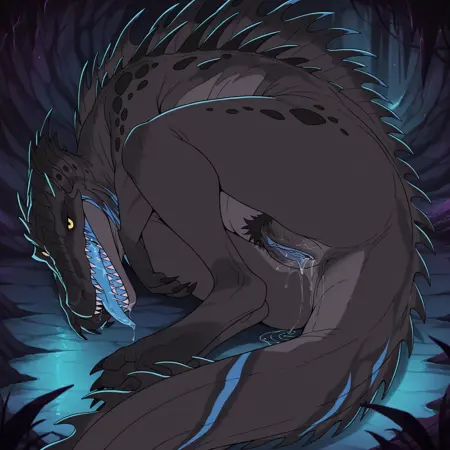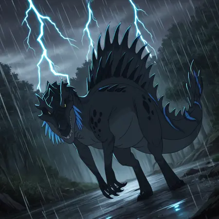 tfury, 1girl, spinosaurus, stripes, blue spikes on neck, black spikes on spine, claws, sharp teeth, closed mouth, tail