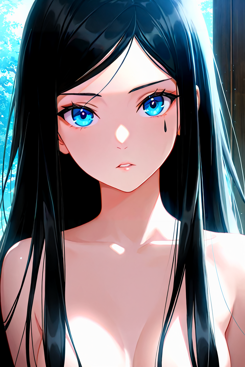 lilisi, long hair, black hair, blue eyes, facial tattoo, tattoo under eye, single facial tattoo