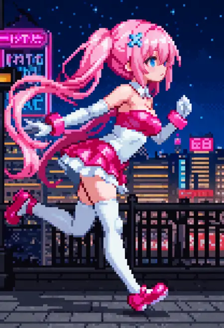 Default outfit : detached collar, white collar, white glove, elbow glove, pink wrist band, strapless dress, medium breast, pink tubetop, white dress, bare shoulder, pink skirt, white thighhigh, pink mary janes,