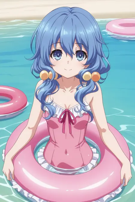 aayoshino, blue eyes, blue hair, yoshinoswim, hair bobbles, pink one-piece swimsuit, frilled one-piece swimsuit, red ribbon,