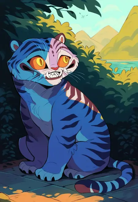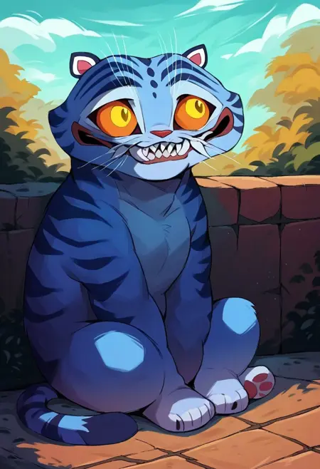 태그: "Kp0p_T1ger, tiger, blue fur, sharp teeth, fangs, glowing eyes, colored sclera, yellow sclera, whiskers, tail"