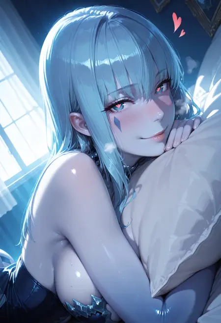 icequeenmge, monster girl, ice, ice wings, blue skin, colored skin, facial mark