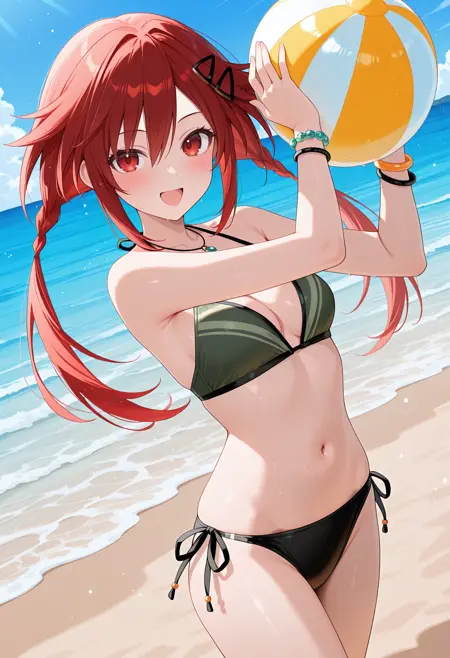 - ntenuzu, red hair, twintails, twin braids, red eyes, hairclip,
