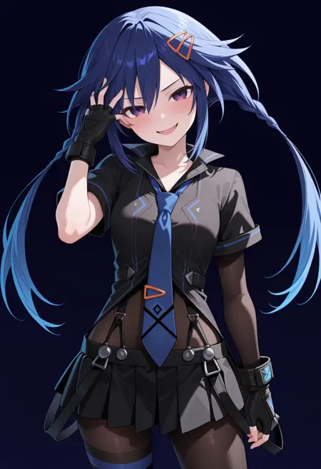 - nkrodef, black shirt, blue necktie, suspender skirt, striped, fingerless gloves, black gloves, pleated skirt, skort, black skirt, black bodystocking, mismatched legwear, black pantyhose,