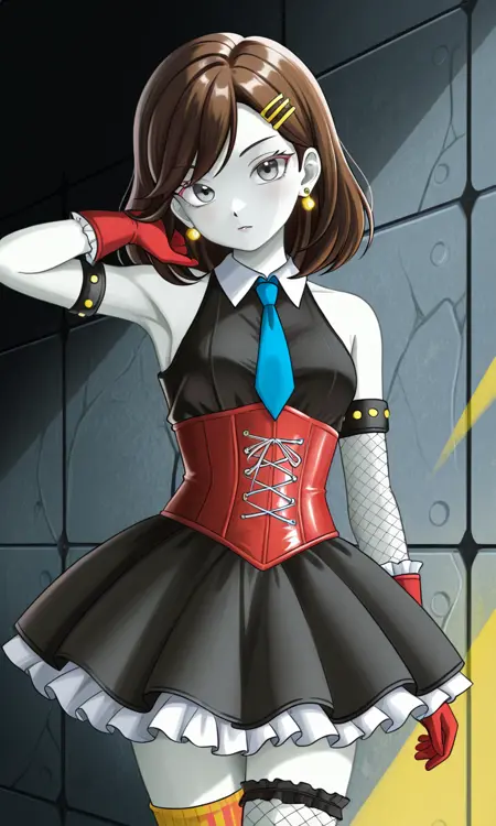 NicoDB, 1girl, solo, black skirt, brown hair, hair ornament, single thighhigh, red gloves, black dress, bare shoulders, jewelry, earrings, frills, detached sleeves, blue necktie, sleeveless, hairclip, striped, medium hair, grey eyes, colored skin, white skin, frilled dress, fishnets, red corset