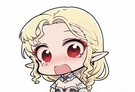 金髪、赤い目、とがった耳、編み髪、アイライナー、外れ襟、胸元、長袖、肩出し、コルセット、赤いスカート