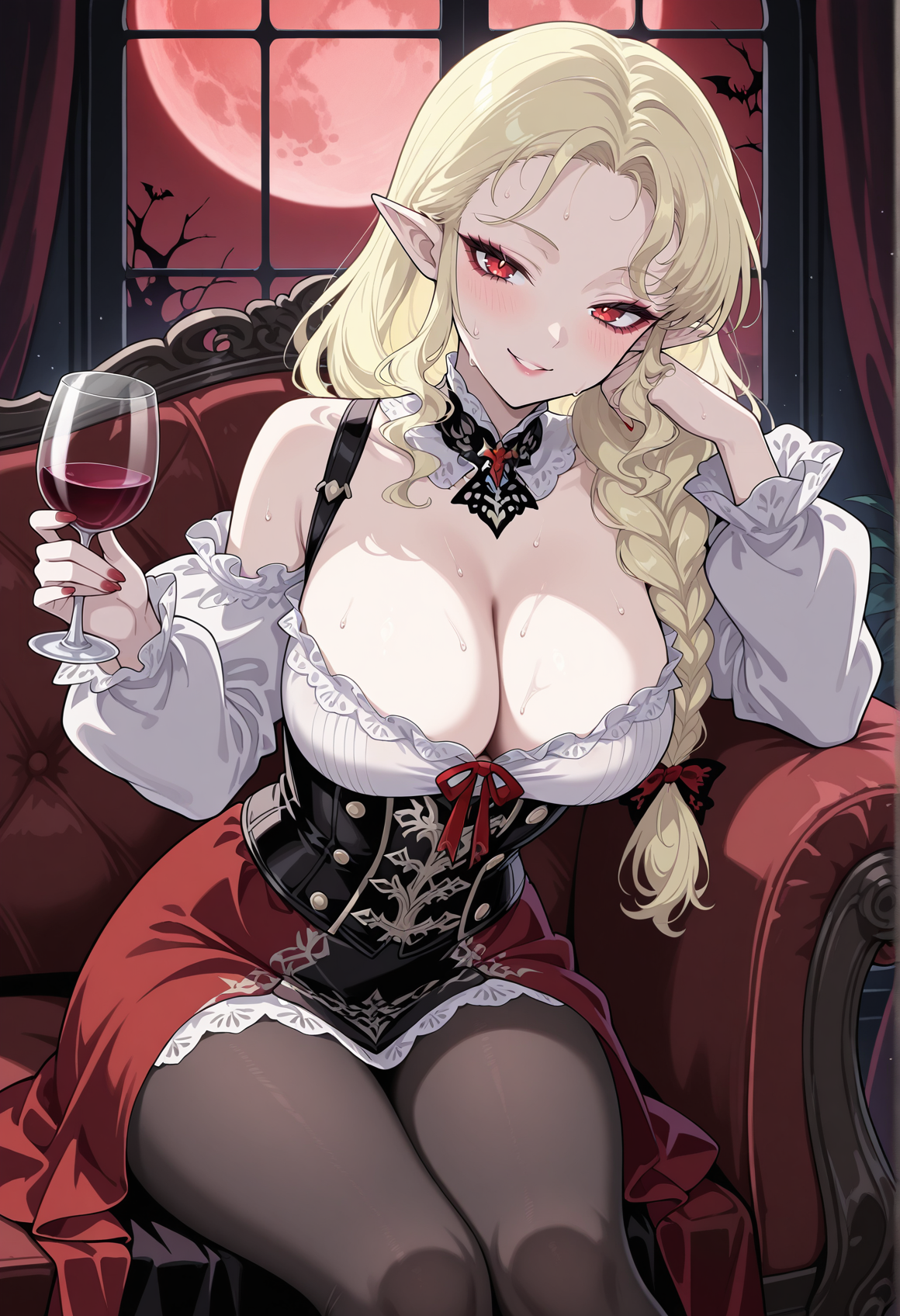 blonde hair, red eyes, pointy ears, braid, eyeliner, detached collar, cleavage, long sleeves, bare shoulders, corset, red skirt