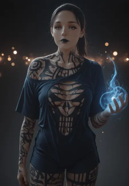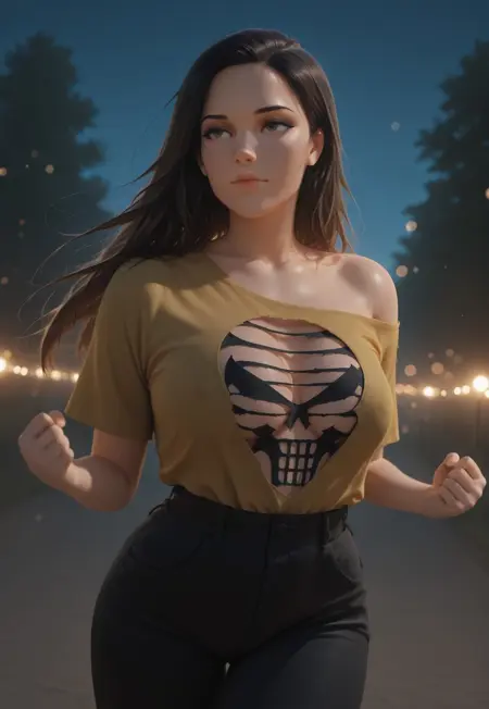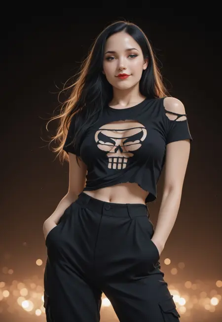 Base prompt: punisher_shirt, ladder cut out, ripped outfit, breasts, shirt, black shirt
