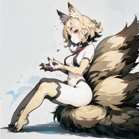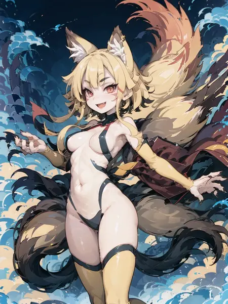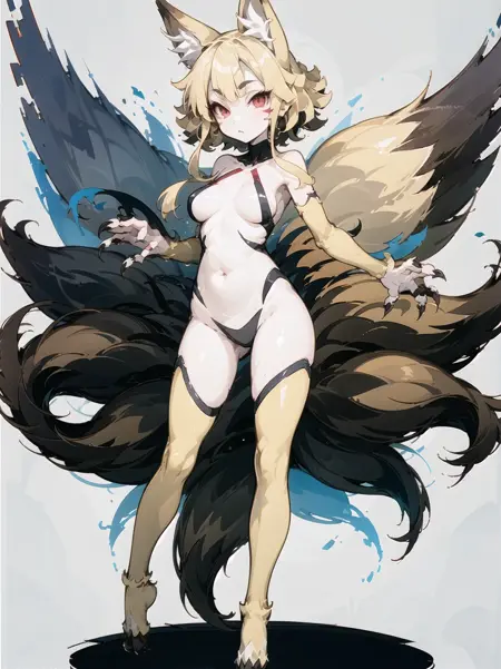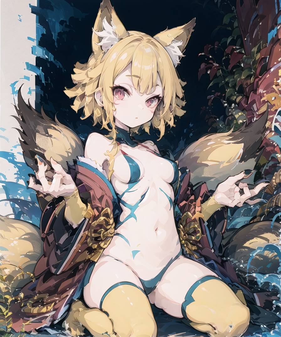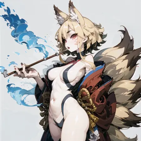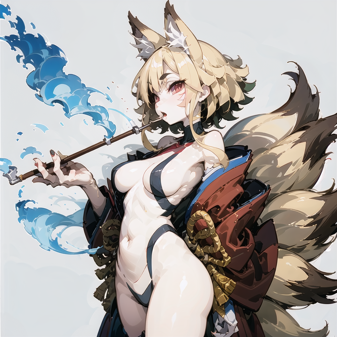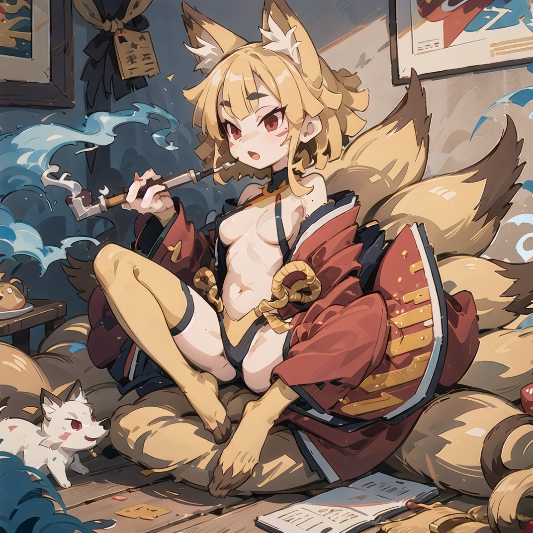 | 训练词汇 | 1girl, solo, ninetailed, fox girl, fox tail, multiple tails, fox ears, blonde hair, red eyes, short eyebrows, medium breasts, facial mark, animal hands, animal feet, claws, thighhighs, navel, sidelock, 已复制! japanese clothes, kimono已复制! smoke, smoking pipe, holding smoking pipe已复制! |