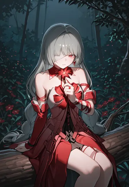 phrolova \(wuthering waves\), grey hair, bandage over one eye, red eye,