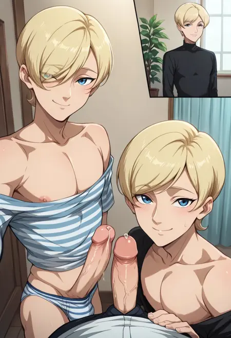 USEFUL TAGS: migi to dali, male focus, yaoi, exact copies, migi, dali, blonde hair, jeans, denim, barefoot, 1boy, pants, blue eyes, white background, male focus, multiple views, short hair, simple background, full body, shirt, black shirt, turtleneck