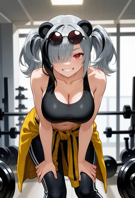 Dojo Star: f34terdojo, streaked hair, grey hair, black hair, hair over one eye, twintails, round eyewear, sunglasses, eyewear on head, animal ears, red eyes, black sports bra, black leggings, track pants, yellow jacket, jacket around waist, bare shoulders, collarbone, stomach, navel, large breasts