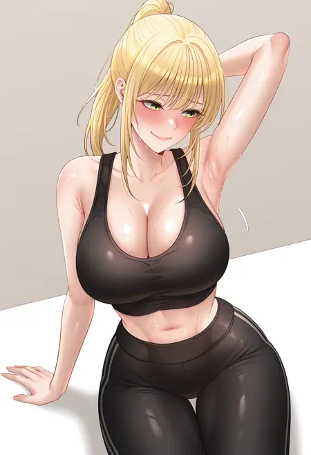 开襟夹克, 蓝色夹克, 白色衬衫, 暴露胸部, 无袖, 裸露肩膀, 露腹, 黑色长裤, 瑜伽裤,