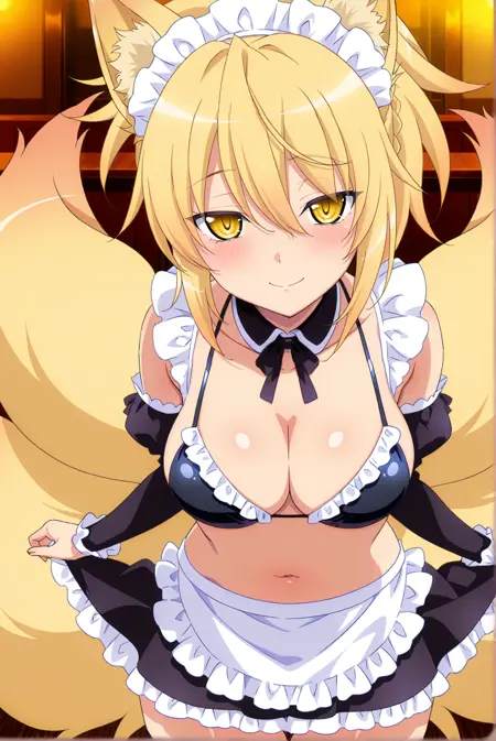 Basic: kunou-dxd, 1girl, yellow eyes, black pupils, blonde hair, ponytail, fox ears, fox tail, multiple tails