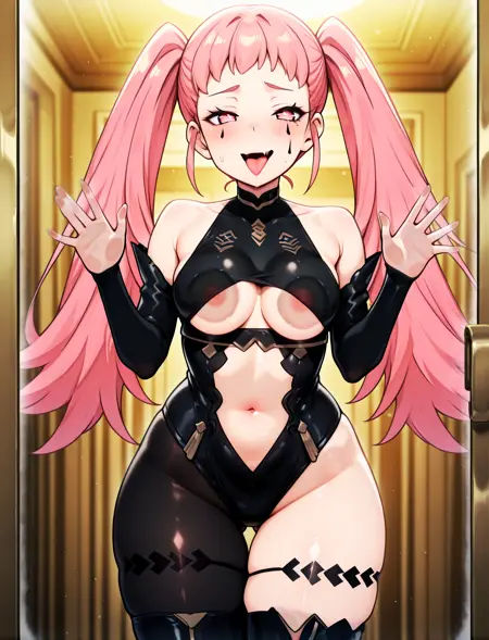 | トレーニングワード | KronyaOutfit, tear facial mark, black eyeliner, black mascara, black revealing outfit, underboob, bare shoulders, fingerless elbow gloves, center opening, navel, clothing cutout, bodysuit, thigh tattoo, black thighhighs, asymmetrical legwear, single leg pantyhose, thigh boots, high heels,コピーしました! |