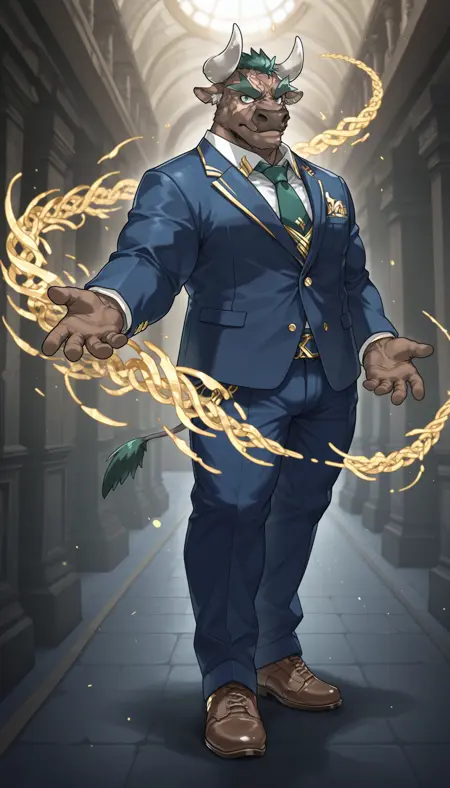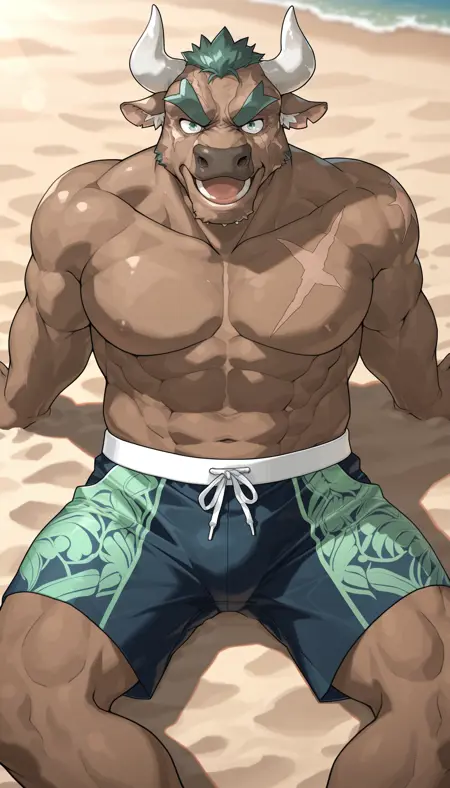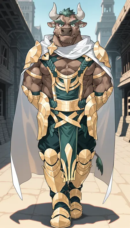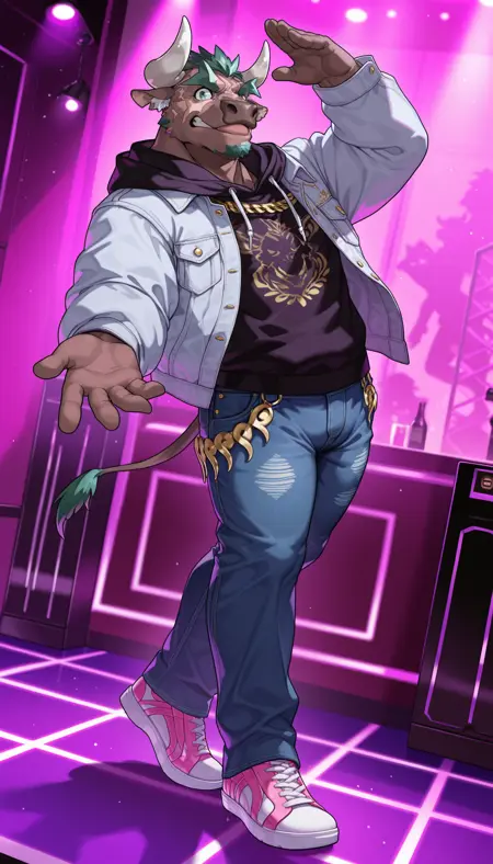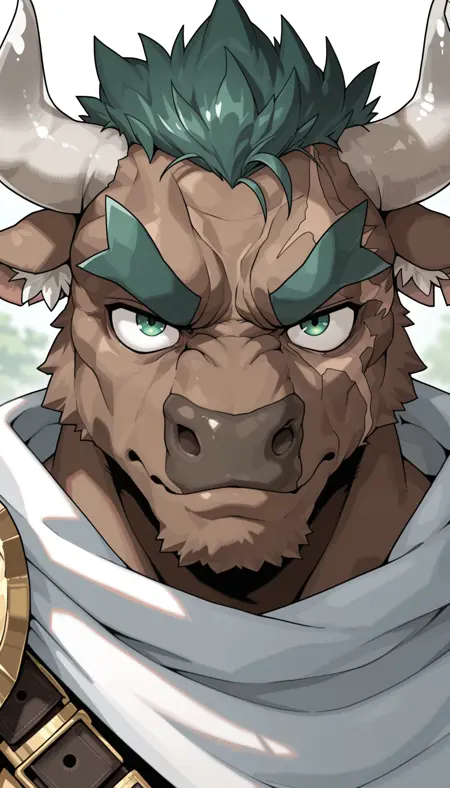 Best prompts: M4rduk, minotaur, cow boy, green eyes, green hair, white ear fluff, scar on face