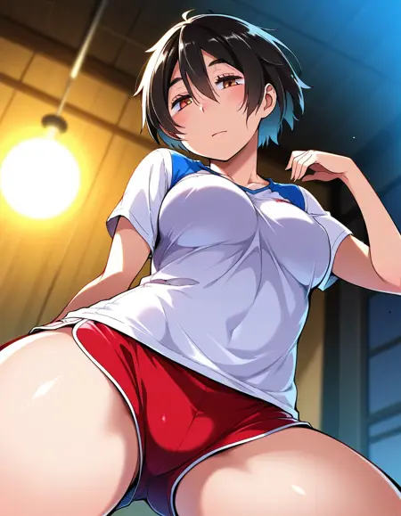 MoriToruneko, short hair, black hair, hair between eyes, brown eyes, white shirt, red shorts, white sneakers,