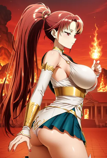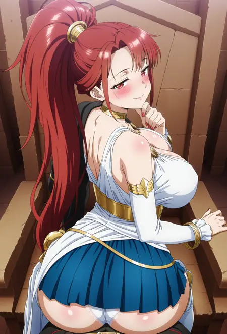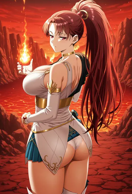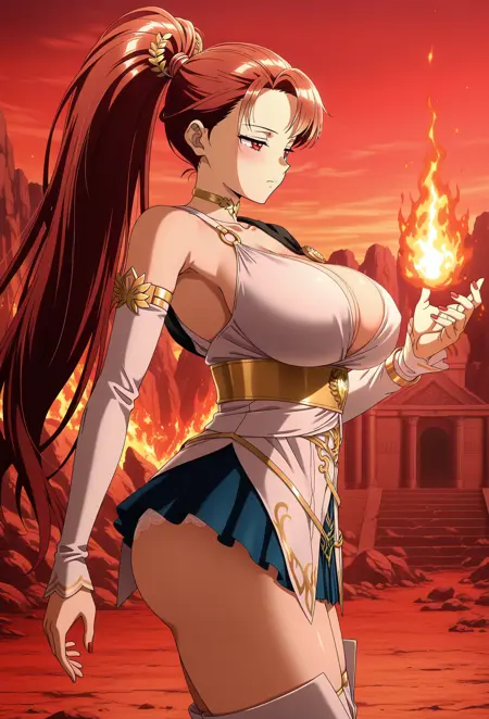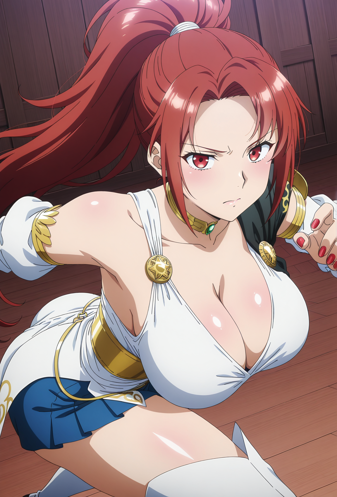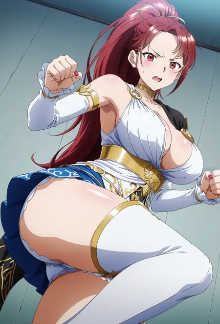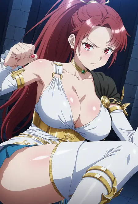 char_ge,成熟女性,熟女,大乳房,巨乳,大屁股,巨臀,深红色头发,额头,马尾辫,高马尾,红眼睛,红指甲,金色项圈,乳沟,锁骨,不对称服装,单侧裸露肩膀,黑色肩布,金色胸针,珠宝,盔甲,连衣裙,白色连衣裙,分离袖子,超短裙,蓝色裙子,不对称鞋履,白色长筒袜,