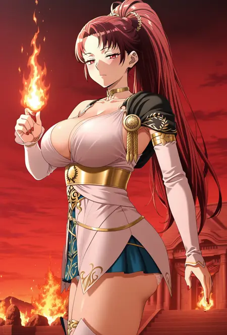 char_ge、熟女、MIFF、大きい胸、巨大な胸、大きいお尻、巨大なお尻、濃い赤髪、額、ポニーテール、高めのポニーテール、赤い目、赤い爪、ゴールドのチョーカー、胸元、鎖骨、非対称な服、片方の肩を露出、黒い肩布、ゴールドのブローチ、ジュエリー、鎧、ドレス、白いドレス、取り外し可能な袖、ミニスカート、青いスカート、非対称な靴、白い太ももハイソックス、