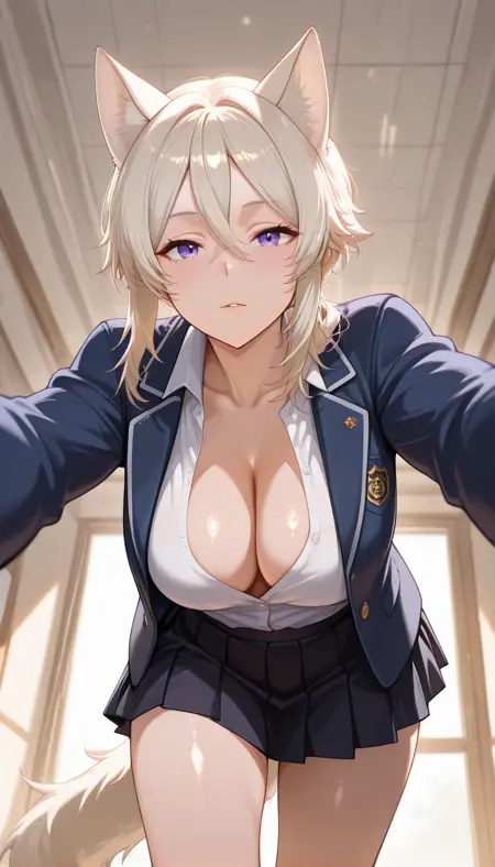 KagenoZeta, 가슴, 큰 가슴, 금발, 동물 귀, 눈 사이의 머리카락, 보라색 눈, 꼬리, 흰색 머리카락, 고양이 귀, 고양이 꼬리, 고양이 소녀, 늑대 귀, 중간 길이 머리, 측면 머리카락, 흰색 머리카락, 회색 머리카락, 긴 머리카락, 낮은 토끼꼬리, 동물 귀 털, 노랑 꼬리,