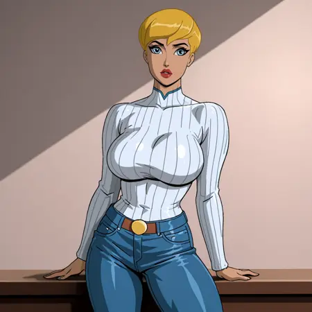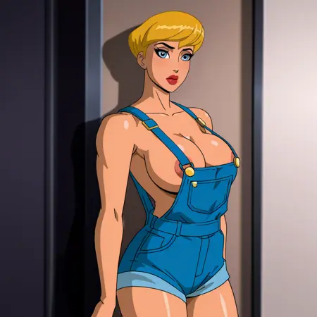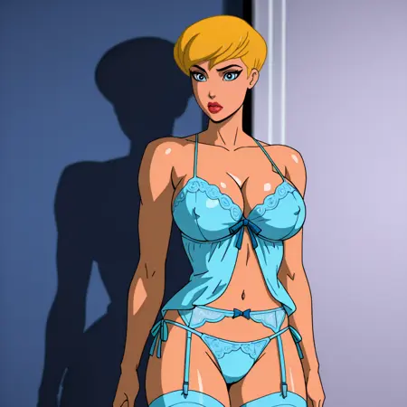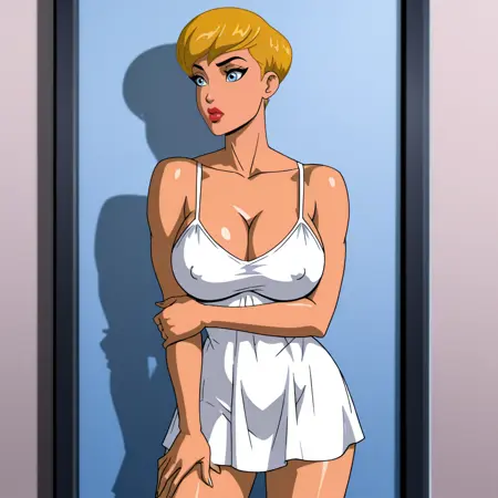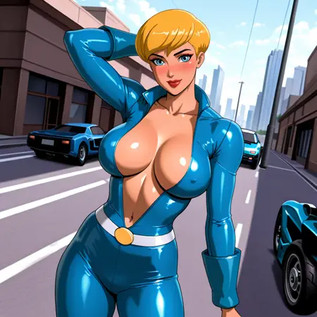 - 트리거: PowerGirlPublicEnemies, 1girl, 클리브에지 컷아웃, 금발, 큰 가슴, 단발, 의상 컷아웃, 망토, 파란 눈, 파란 장갑, 흰색 레오파드, 슈퍼히어로, 립스틱, 메이크업, 입술, 벨트, 검은 피부
