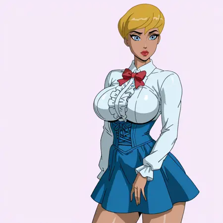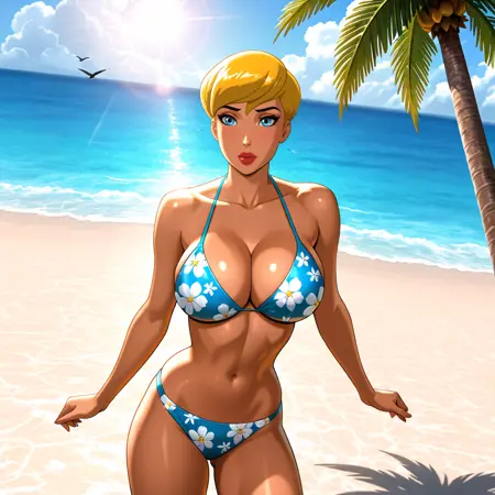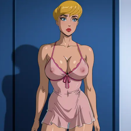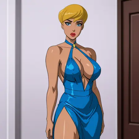 Trigger : PowerGirlPublicEnemies, 1girl, cleavage cutout, blonde hair, large breasts, short hair, clothing cutout, cape, blue eyes, blue gloves, white leotard, superhero, lipstick, makeup, lips, belt, dark skin
