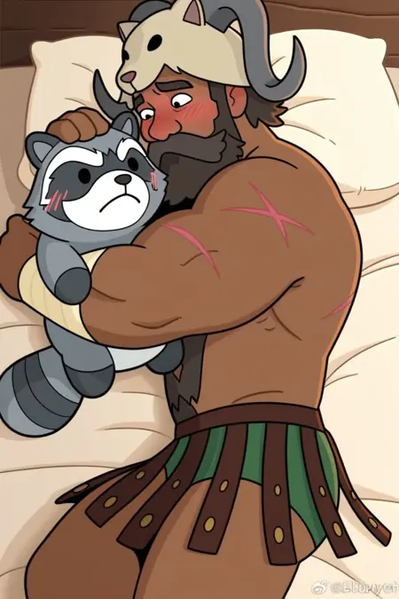 1man,solo,male focus,dark skin,scars,brown hair,short hair,beard,facial hair,chest hair,muscular,bara,mature male,armor,helmet,bandages,leather studded skirt,green briefs