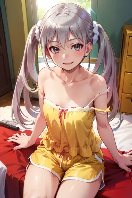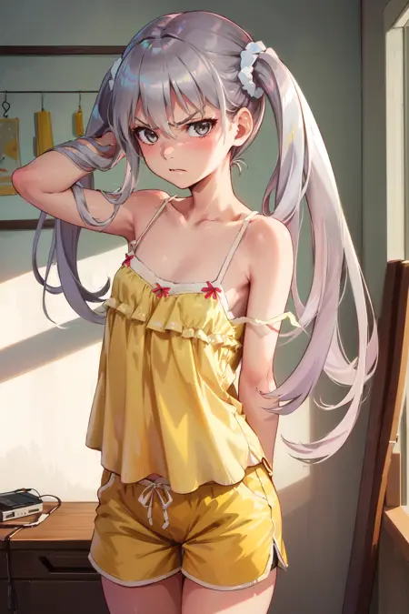 oikurasodachi, 灰色眼睛, 黄色背心, 裸露肩膀, 乳房, 平胸, 黄色短裤