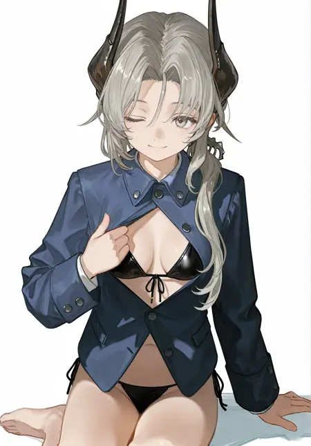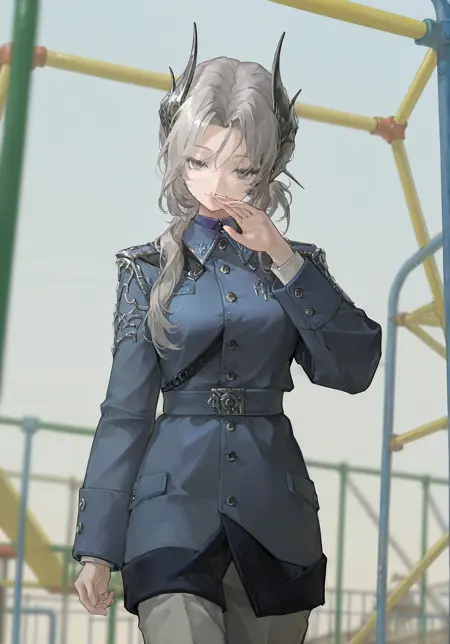Sentinel \(reverse:1999\),long hair,bangs,long sleeves,gray eyes,gray hair,jacket,horns,pants,military,parted bangs,military uniform,buttons,blue jacket,dragon horns,