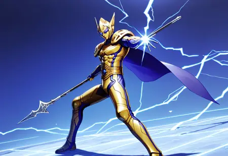 SMTV_Odin, gold armor, blue trim, jagged spear, blue cape, gold helmet