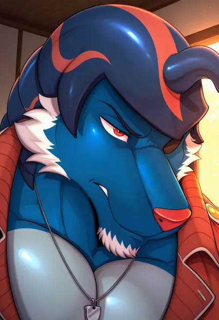 强化提示:”毛茸茸的,尾巴,红眼睛,肌肉发达,阳刚,宽大的胸肌“