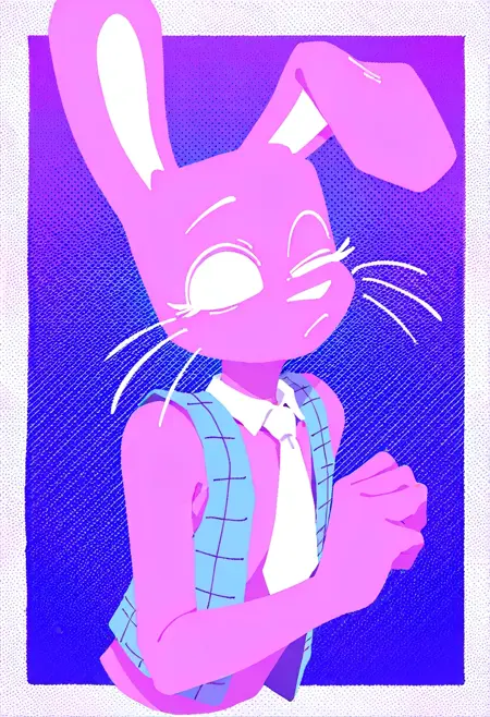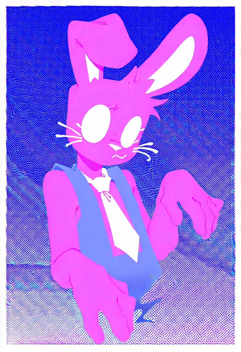 BunBunB3, completely white eyes, pink bunny, upright bunny ears, white nose, white whiskers, cyan vest, white necktie, stylized, abstract, jagged, floating, ghost-like,