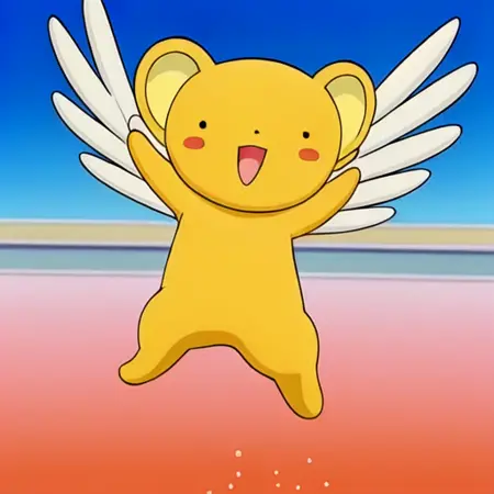 tags recommended: Kero, yellow fur, small dot eyes, small black pupils, flying, tail, angel wings, round ears, round head, fingerless hands,, dot nose, small mouth, pokemon creature