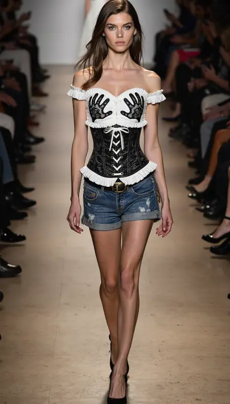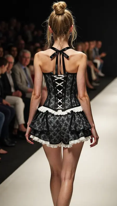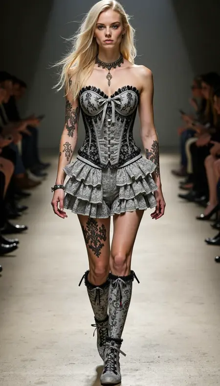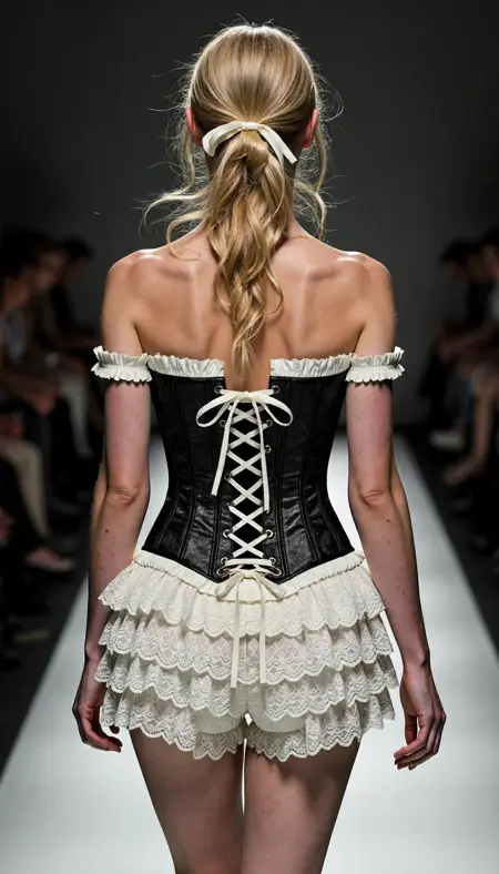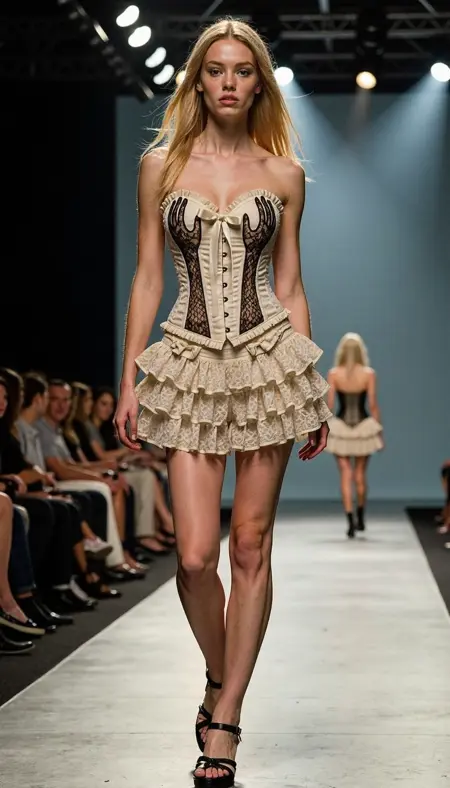 我使用的提示:"A pretty girl walks down the runway dressed in corset"