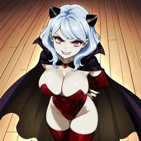 | 训练词汇 | vm_Velina, 1girl, solo, vampire, pale skin, white skin, colored skin, pink eyes, horns, short horns, black horns, white hair, medium hair, large breasts, cleavage, sharp fingernails, black cape, see-through cape, red leotard, strapless leotard, bridal gauntlets, red thighhighs已复制! |