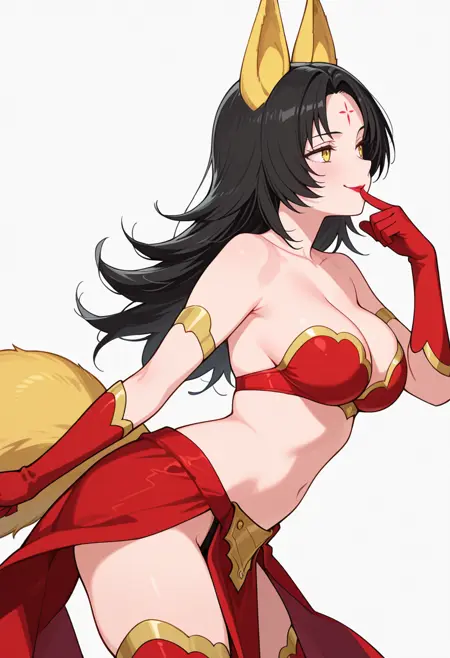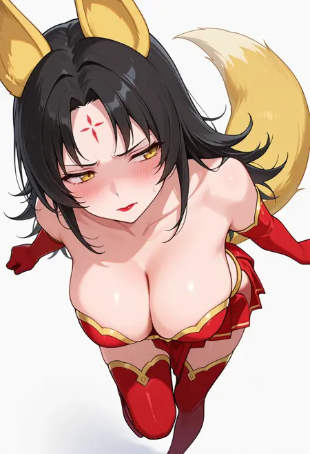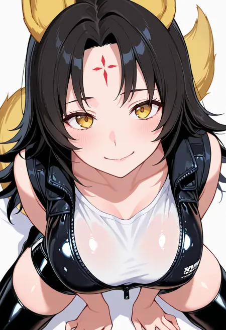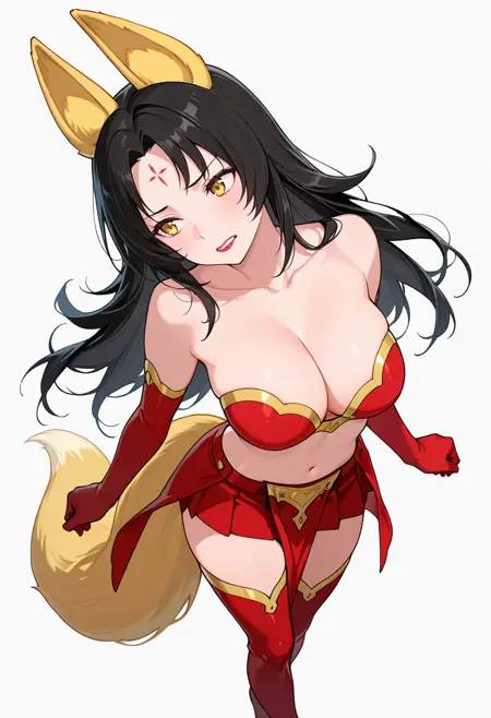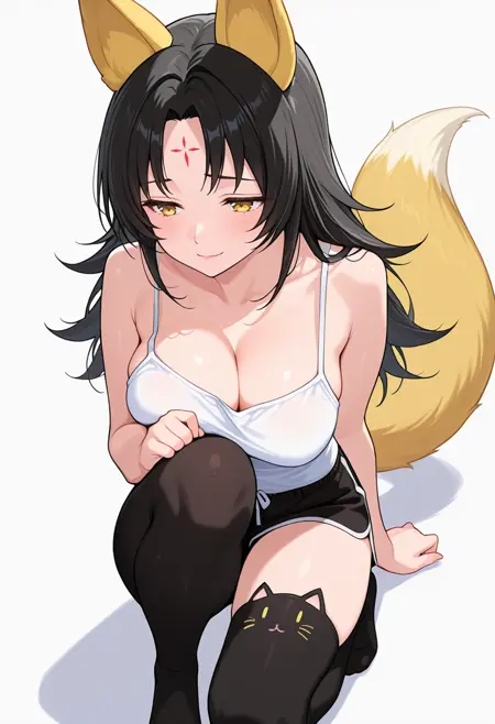 magino_cnr, 1girl, black hair,long hair, yellow eyes,parted bangs,fox ears,fox tail,forehead mark,large breasts,