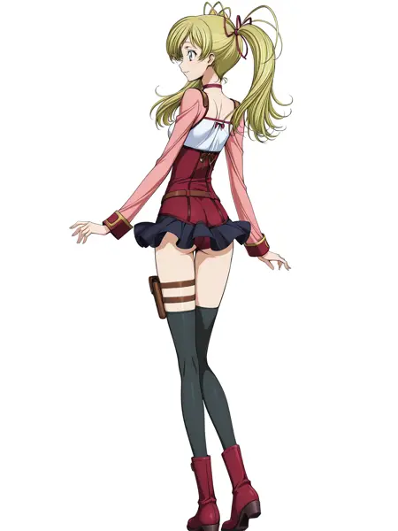 LilalaBrita,1girl,solo, blonde hair,twintails,long hair,blue eyes, choker,hair ribbon, skirt,ribbon,long sleeves,thighhighs,boots,black thighhighs,miniskirt,zettai ryouiki,thigh strap,one holster,
