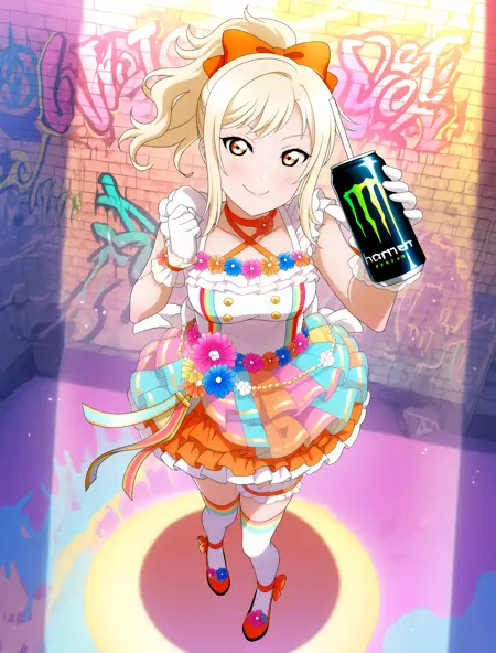miyashita ai, high ponytail, hair between eyes, orange halterneck strap, orange inner skirt, four buttons, asymmetrical mismatched legwear, orange high heels, orange bow, flower-trimmed hair bow- 🍞 エマ・ヴェルデ / emma verde