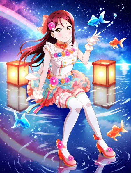 yuki setsuna, long hair, red halterneck strap, red inner skirt, four buttons, asymmetrical mismatched legwear, red high heels, red bow, flower-trimmed hair bow- 💧 桜坂しずく / osaka shizuku